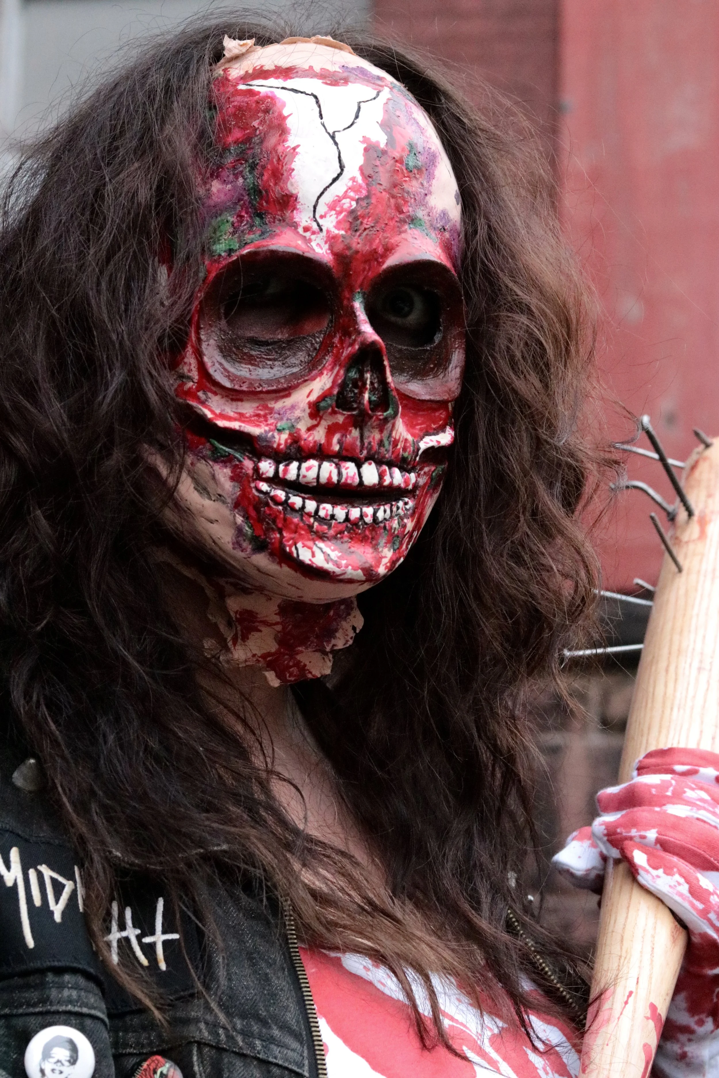 This is the 4th latex mask I made from the skull mold. My friend Hollie was kind enough to model it for me at the abandoned school up the street from my house. I added some bloodiness to this shoot with a tank-top, gloves, and a battle bat. All other wardrobe is Hollie’s own.