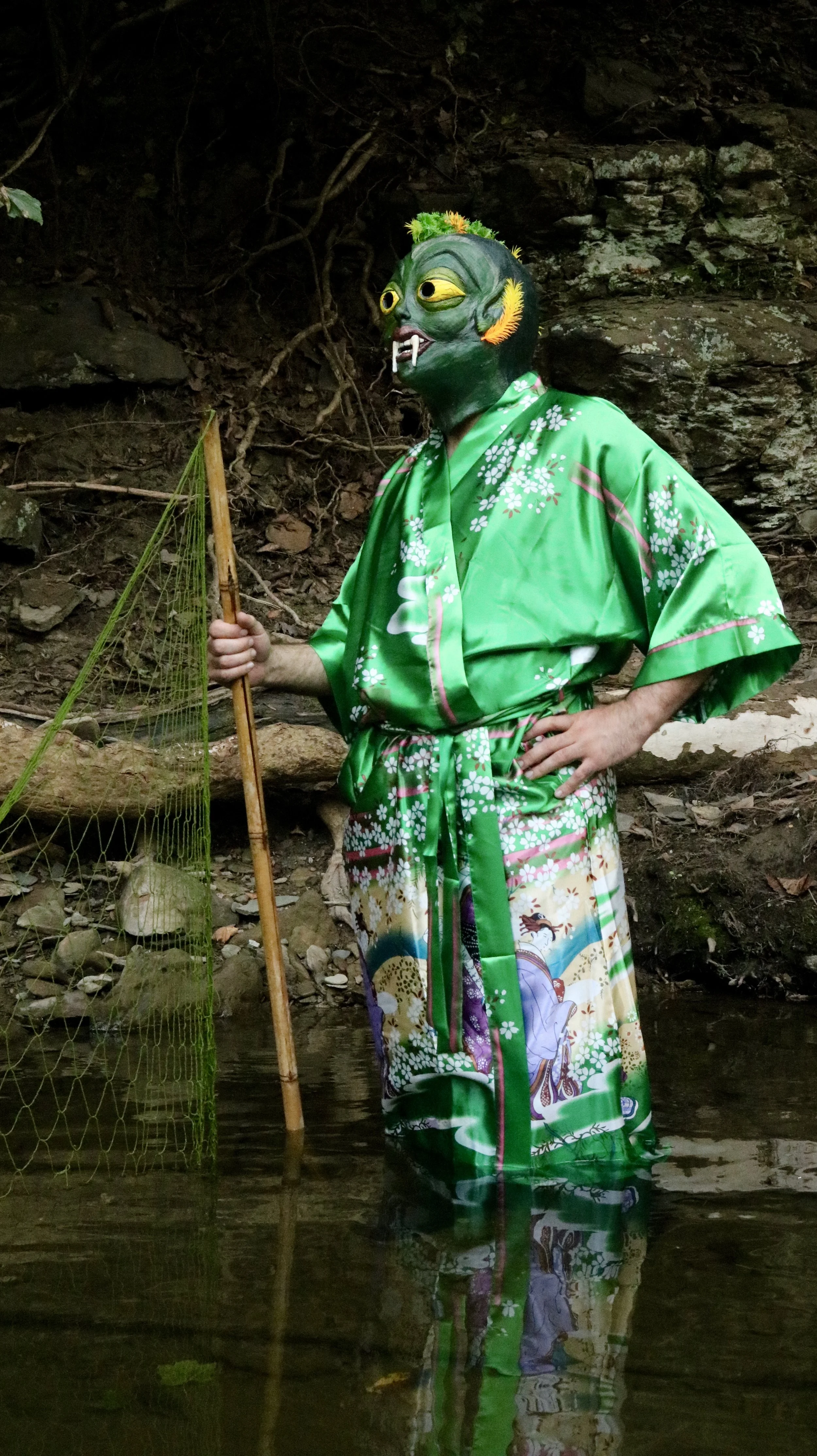 This is my 7th shoot and 2nd mask made from the vampire mold. I was going for a swamp creature style by suggestion from a friend. I completed the piece with plastic, fish tank seaweed for hair. My friend Mike pulls off the kimono quite nicely in the Millvale creek.