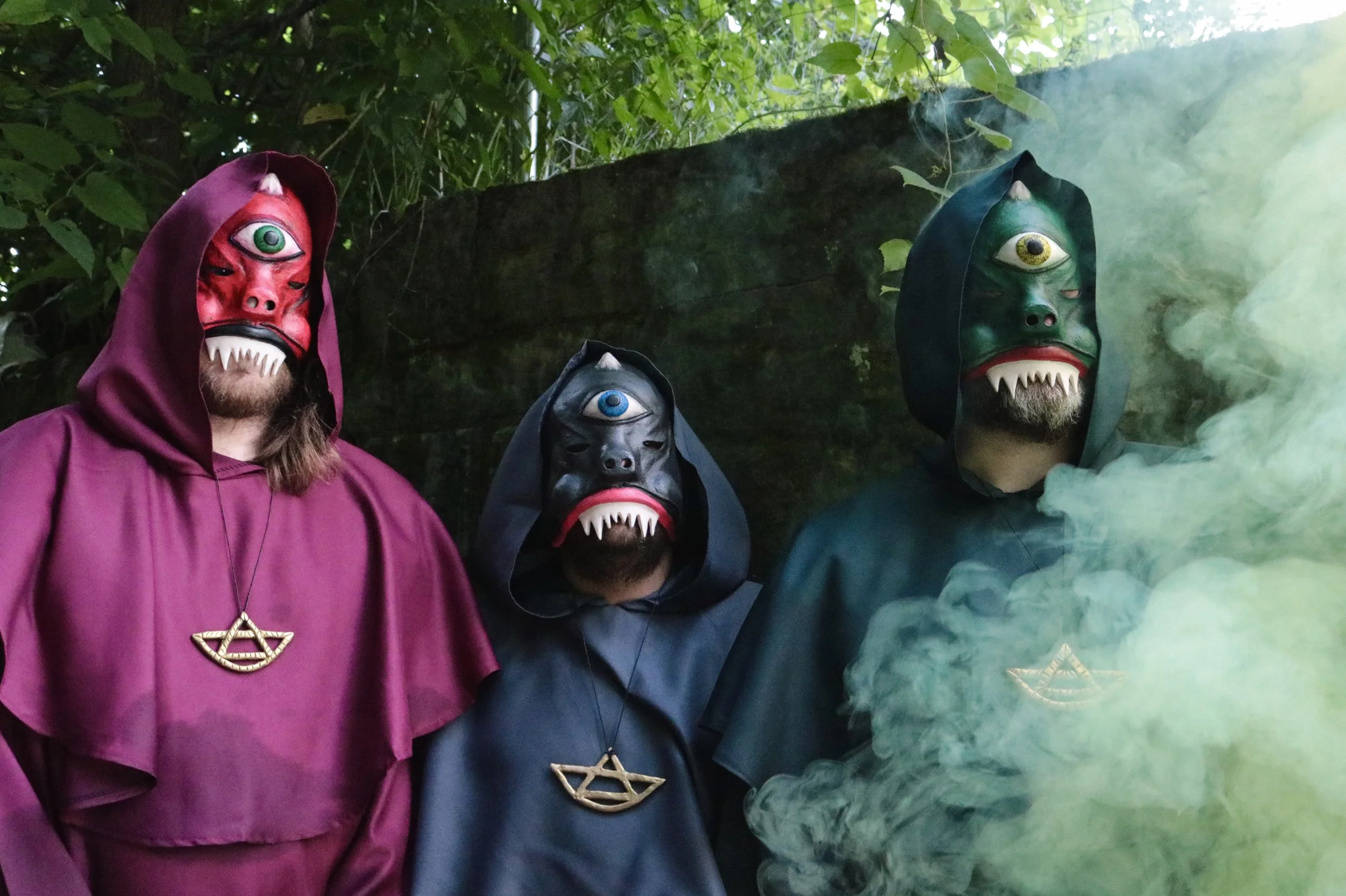 This is the 4th set of latex masks made from an original sculpture. I decided to try out a 3/4 mask for these cyclops creeps. For the photos, I was going for a kitsch, over-the-top, occult vibe. (basically, some weird local, mutant cult) . My friends where kind enough to don hooded robes and wade through Girty’s Run in Millvale, PA. The pendants are a symbol I made up and crafted with Super Sculpey.