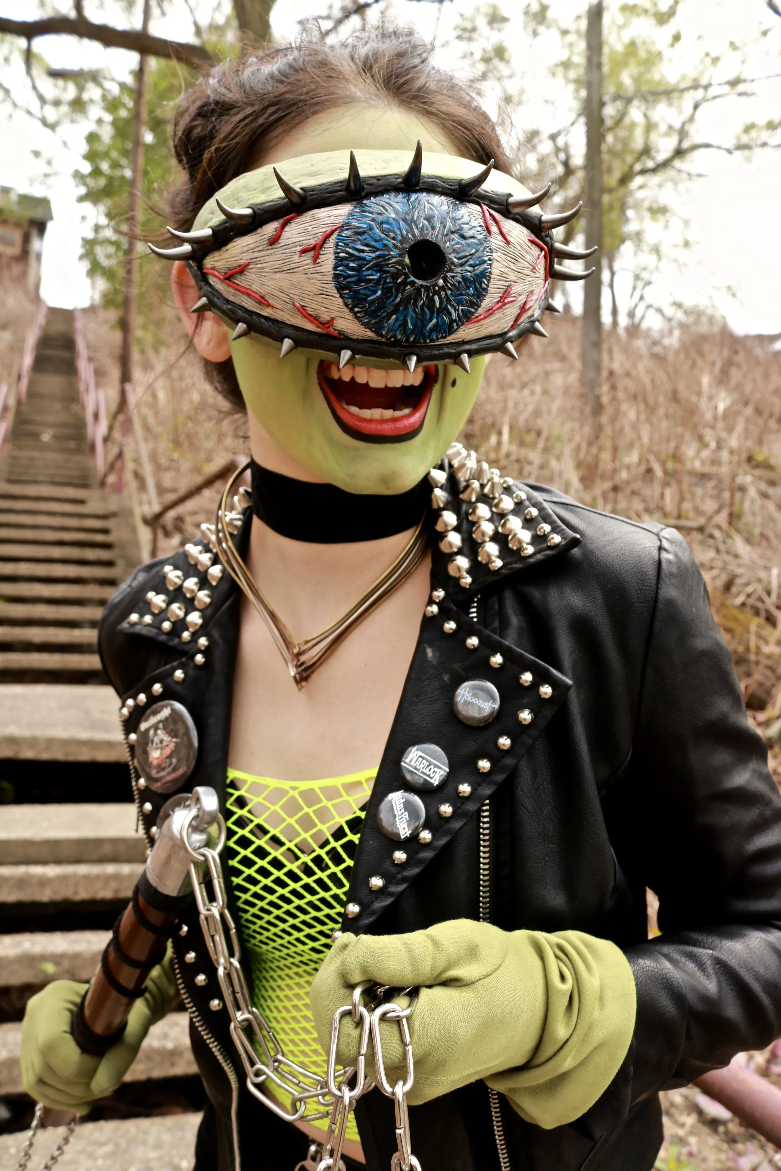 This is the EYE mask; inspired by my LIPS mask I made last year. I added some spikes to this one in place of plastic eyelashes. The amazing Clarissa is modeling with a mace from Pakistan and her own wardrobe.